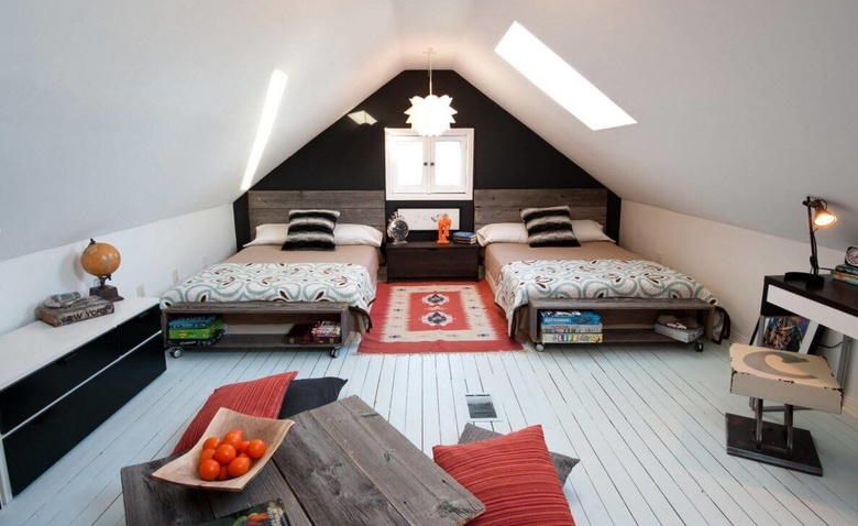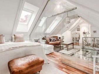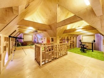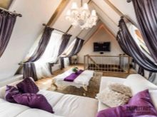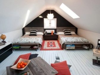 Dachboden, wie die Praxis zeigt, kann ein Raum nicht nur mit einem einzigen Zweck sein. Wenn der Raum eine große Fläche hat, ist es leicht, ihn in Zonen zu unterteilen.