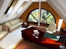 Wenn das Mansardenzimmer ziemlich groß ist, können Sie nach der Arbeit mit der Familie ein gemütliches Wohnzimmer für die Aufnahme von Gästen oder ein abendliches Beisammensein einrichten. Dank der Fenster erhält der Raum genügend Licht und hat einen ausgezeichneten Überblick über die lokalen Sehenswürdigkeiten. Deshalb Vorhang nicht die Fenster anaber es ist besser, einen kleinen Stuhl oder ein weiches Sofa in ihrer Nähe zu stellen.