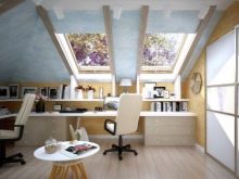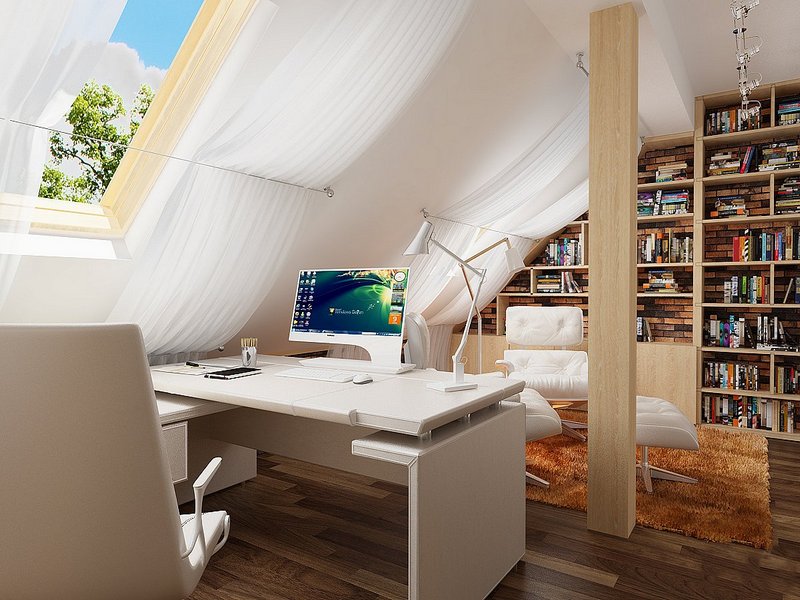 Dachboden ist auch der beste Weg, einen Schrank zu schaffen, da er von allen abgeschirmt ist, was bedeutet, dass Sie hier sicher arbeiten können und nicht auf den Lärm reagieren, der von anderen Räumen kommt. Es ist angemessen und Werkstatt, und eine Bibliothek, und Sie können einfach einen Platz für die Arbeit an einem Computer einrichten. Schattierungen für die Gestaltung dieser Art von Raum ist besser zu neutralisieren, entsorgt Aktivität, so dass Sie sich nicht schnell müde fühlen.