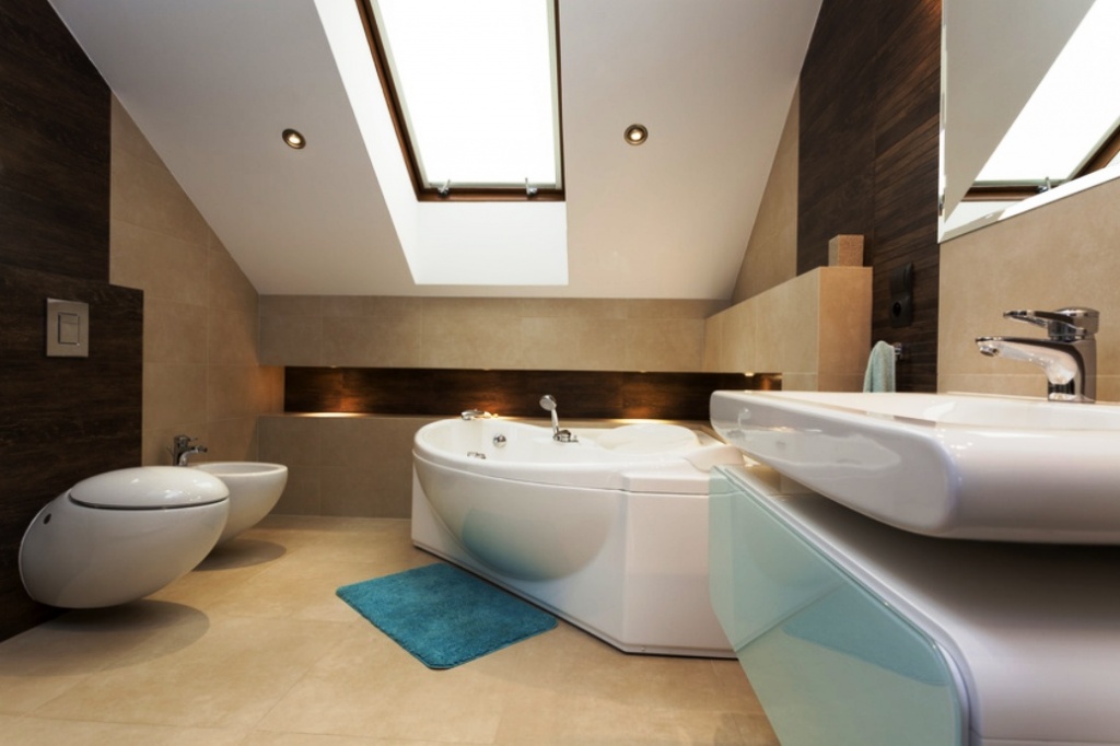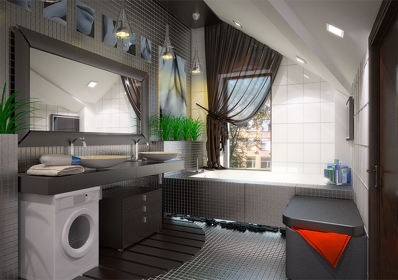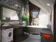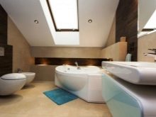 Es scheint, dass es lächerlicher sein kann, als ein Badezimmer auf dem Dachboden zu platzieren. Aber auch für sie können Sie die notwendigen Voraussetzungen schaffen. Darüber hinaus gibt es im Zimmer Fenster und keine Aussicht auf die Nachbarn.Der Raum hat eine große Fläche, so dass die Designer einen Ort haben, um sich umzudrehen.
