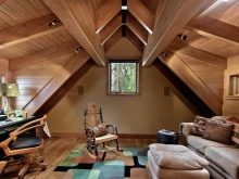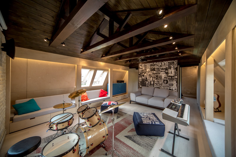 - Babyzimmer. Kinder werden sich im Kinderzimmer auf dem Dachboden wohl fühlen. Der Raum ist so groß, dass sogar für eine Fahrt mit einer Schreibmaschine oder einem Motorrad Platz ist.Das Kind wird so viel wie möglich spielen können, während es von den Eltern beaufsichtigt wird. In der Mitte des Raumes befindet sich ein Sofa und ein kleiner Hocker, in dem Erwachsene Platz nehmen und ihr Baby beobachten können. Wenn das Kind vom Reiten müde wird, kann es sich auf einer großen Couch ausruhen, die gegen die geneigte Wand montiert ist. Das Parkett auf den Böden harmoniert mit der Holzverkleidung an den Wänden und der Decke und schafft so eine warme Atmosphäre. In so einem Raum kann die ganze Familie ausruhen.