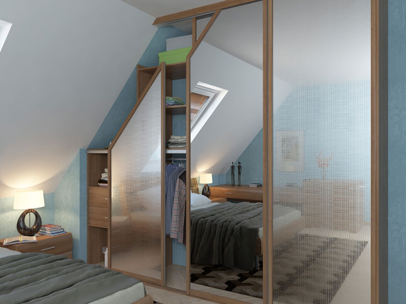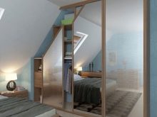 Da der Dachboden eine ungewöhnliche Form hat, und dann Möbel für ihn aufheben, können Sie in eine Zwickmühle geraten. Wenn das Bett oder das Sofa an irgendeiner Stelle fallen, dann werden die Schränke am besten mit eingebauten Giebeln getragen. Für Kleider auf Kleiderbügeln ist das mittlere Fach geeignet. Andere Dinge können auf die Seitenblöcke gelegt werden, die viel niedriger platziert werden sollten.
