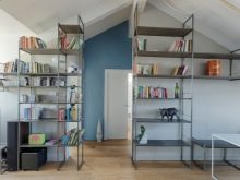 Um die Bibliothek auf dem Dachboden auszustatten, können Sie Regale installieren, die einen geschlossenen und offenen Teil haben.In einem offenen Bereich ist es besser, jene Bücher zu platzieren, die am häufigsten gelesen werden, und solche, die weniger häufig verwendet werden - in geschlossenen. Wenn die Anordnung des Raums auf diese Weise abgeschlossen ist, sammelt sich kein Staub auf der Oberfläche an.