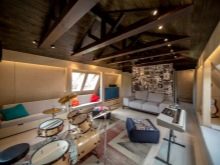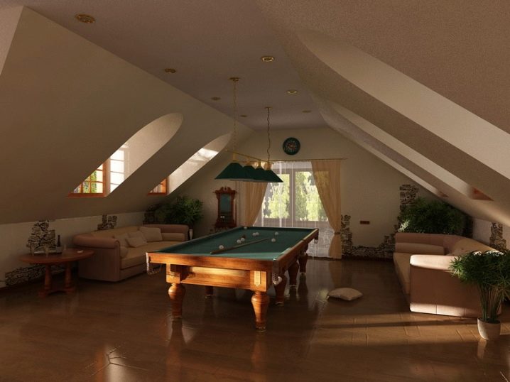 - Gemütliches Wohnzimmer. Die beste Option wäre die Anordnung des Wohnzimmers. Die Wände und die Decke sind in Pastellfarben gehalten. Es ist in Harmonie mit den Sofas auf beiden Seiten des Dachbodens. Ein Billardtisch, der in der Mitte des Raumes steht, ermöglicht der Firma, nach der Arbeit ein wenig Spaß zu haben und sich zu entspannen.