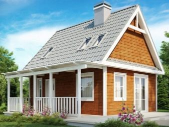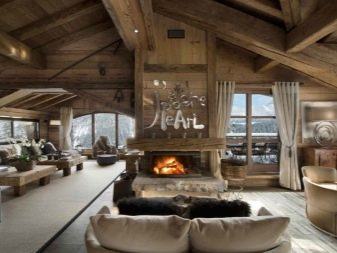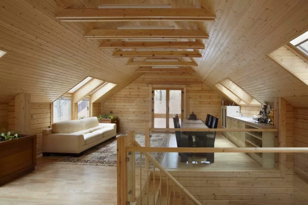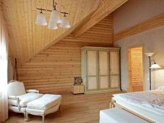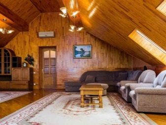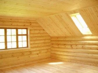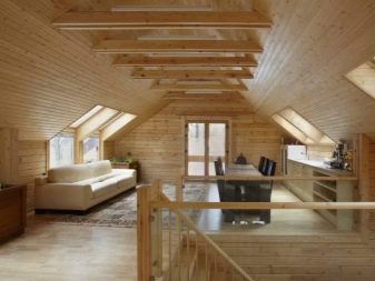 In Bezug auf die Fertigstellung des Dachbodens des Hauses oder der Hütte, die wie Holzhäuser aussehen, kann es vollständig aus Holz oder einfach mit entsprechenden Einsätzen ergänzt werden.