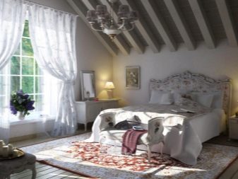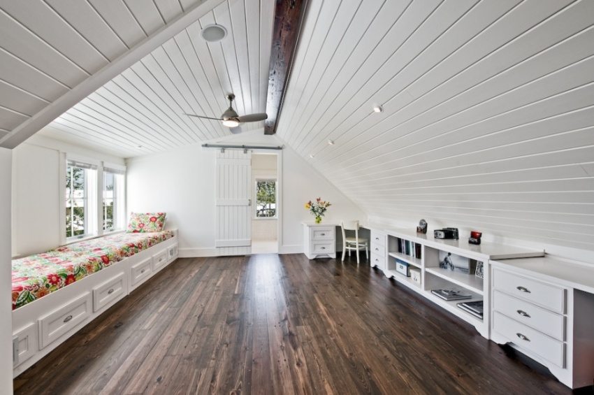 Die Farbe des Raumes und die Einrichtung hängen direkt mit dem für den Dachboden gewählten Stil zusammen. Für moderne Lösungen geeignetes Design in hellen Farben.. Zum Beispiel können Decken weiß gestrichen werden, und der Boden kann mit umweltfreundlichen Materialien bedeckt werden. Für die Gestaltung eines solchen Zimmers eignen sich Stile wie Provence oder Country.