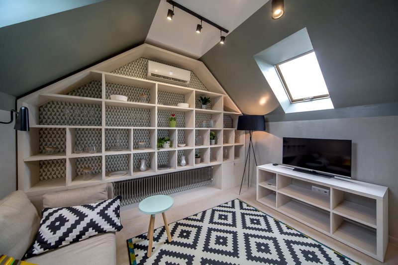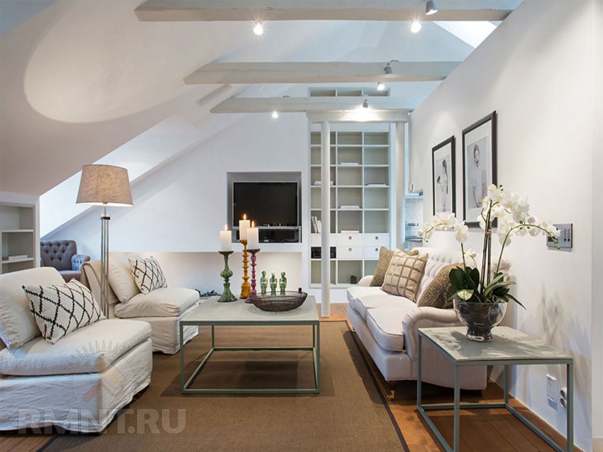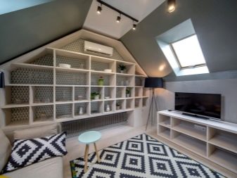 Wenn man sich mit der Anordnung des Wohnzimmers beschäftigt, stellt man sich sofort den Problemen, die mit der Neigung der Wände verbunden sind, da dies sofort die Frage aufwirft, wo die Schränke oder Gestelle kneten sollen, die ein wichtiges Attribut des Wohnzimmers sind. Der beste Ort, um sie zu platzieren, ist die vertikale Seite des Dachbodens.. Es lohnt sich, kompakte Möbel zu wählen, und Sie können auch selbst Nischen machen. Es ist besser, die Racks in der Mitte des Raums zu platzieren, wodurch der Raum sofort in Zonen aufgeteilt wird.