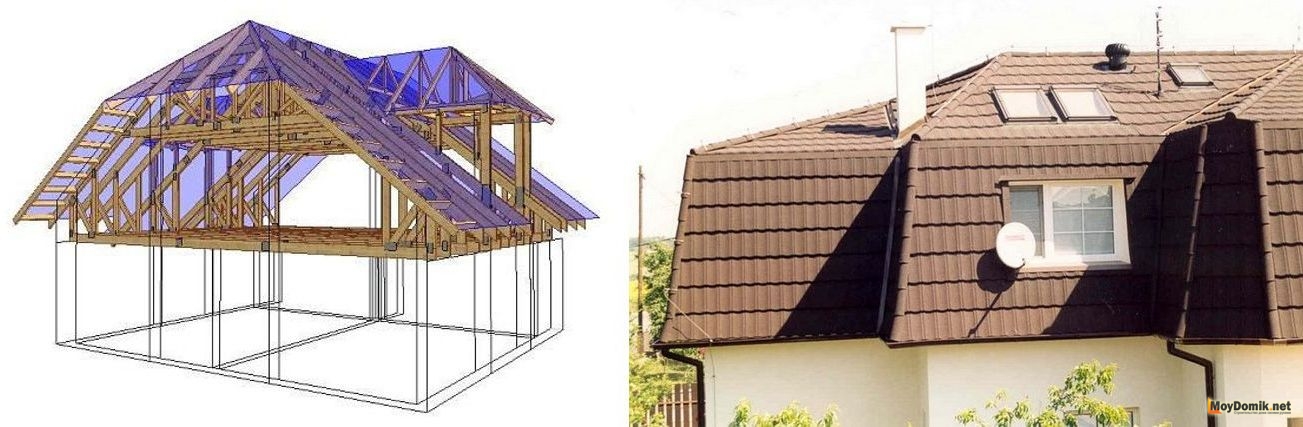 - Tschetyrehskatnaja. Für ein derart komplexes Dachsystem ist es notwendig, eine Zeichnung zu erstellen. Die Oberfläche des Dachbodens ist riesig, die Kosten für die Raumerwärmung steigen deutlich und die Größe im Inneren des Gebäudes wird kleiner, da die Flächen von vier Seiten abgeschnitten sind. Die viergleisigen Dächer sind windresistent. Aufgrund der Neigung der Oberfläche wird eine starke Windlast nicht so stark beeinflusst. Häuser mit solchen Dächern gelten als die attraktivsten - Walmdächer gehören zu dieser Kategorie. Der Rahmen für sie ist mit zusätzlichen Rampen verstärkt, da die gesamte Ladung hier fällt.