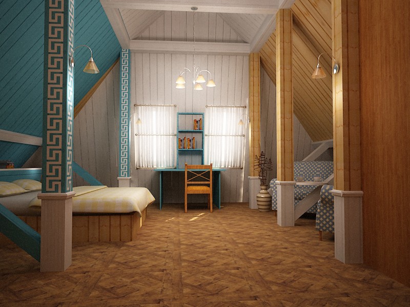 Wenn Sie den Dachboden bauen, müssen Sie keine dunklen Farben wählen - sie werden ein Gefühl von Druck vermitteln. Für Wände ist es besser, Holz oder seine Nachahmung zu verwenden. Materialien müssen Licht wählen um die ohnehin schwere Konstruktion nicht zu belasten.