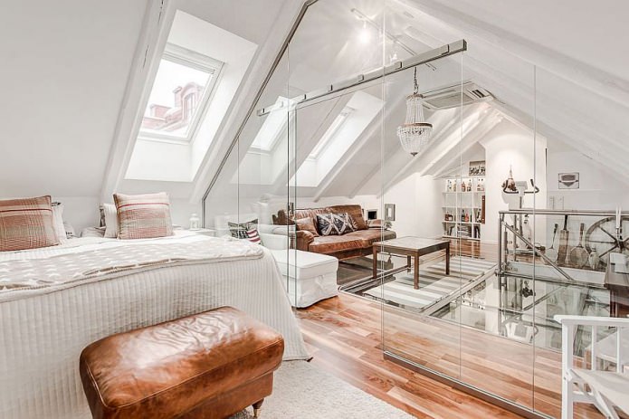Der Dachboden kann auf zwei Arten in Zonen eingeteilt werden: Studio und Mobilfunk. Die erste Option umfasst den freien Verkehr von öffentlichen und privaten Zonen. Die zweite beruht im Gegenteil auf der Aufteilung des Raumes in getrennte Räume.
