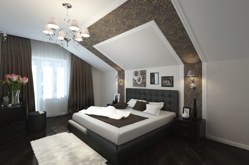 Das Weiß des Bettes harmoniert mit der weißen Decke und schafft Gemütlichkeit und Ruhe. Dieser monophone Hintergrund wird mit anmutigen Mustern in Form verschiedener Monogramme verwässert, die sehr charmant wirken. Innerhalb der schrägen Wand ist eine kleine Nische gebaut, in die man schöne Gegenstände wie eine Vase stellen kann.