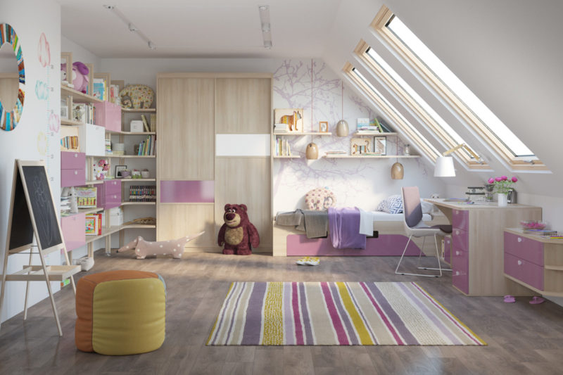 Niedrige Wände - das ist die beste Option, um aus dem Dachboden ein Kinderzimmer zu machen. Das Kind wird sich dort wohl fühlen, anders als ein Erwachsener.
