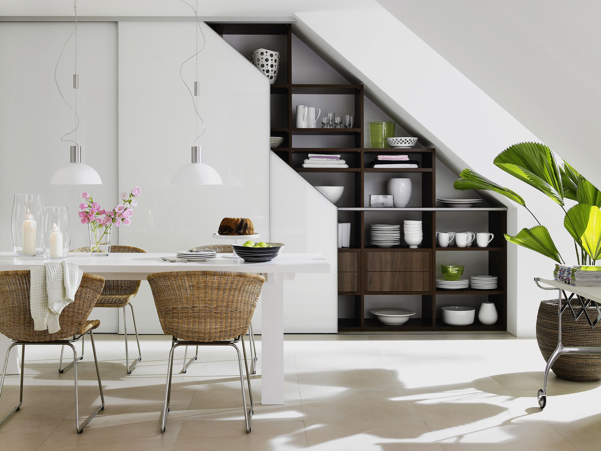 Für Abrichter oder Tischflächen geeignete Abhänge. Wenn sich ein Esszimmer in einem solchen Raum befindet, dann müssen Sie über den Ort nachdenken, an dem das Geschirr aufbewahrt wird. In diesem Fall ist es auch möglich, die Giebel zu verwenden, indem Glasregale unter ihnen errichtet werden.