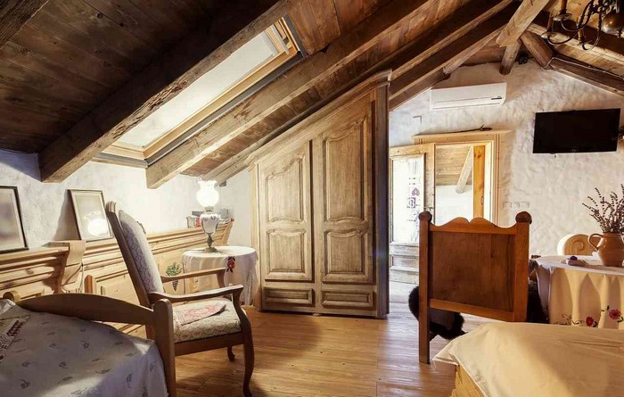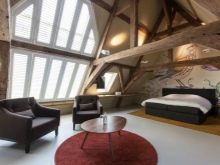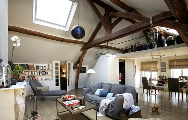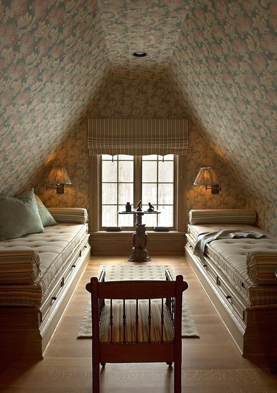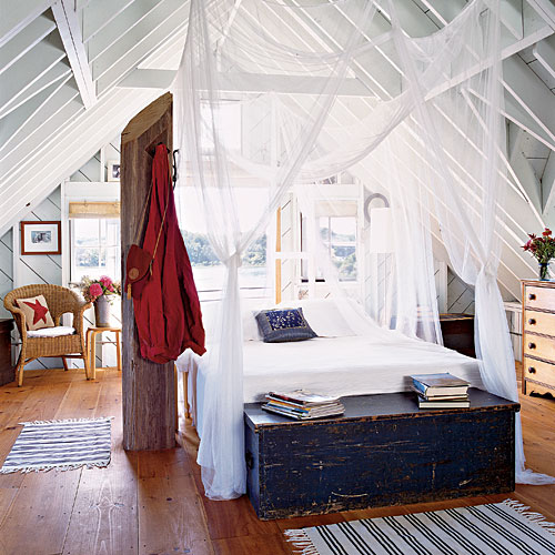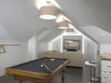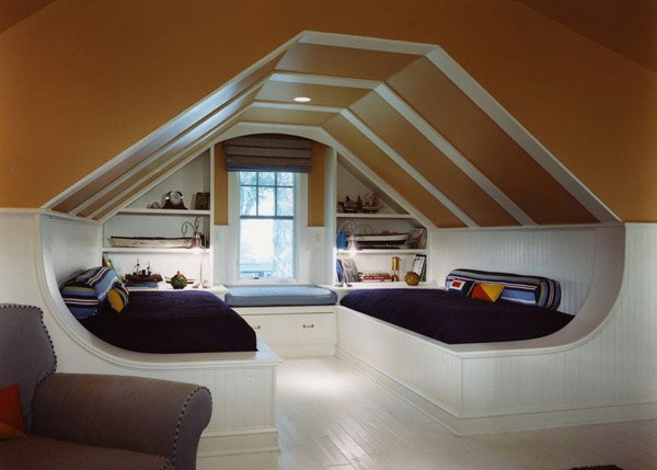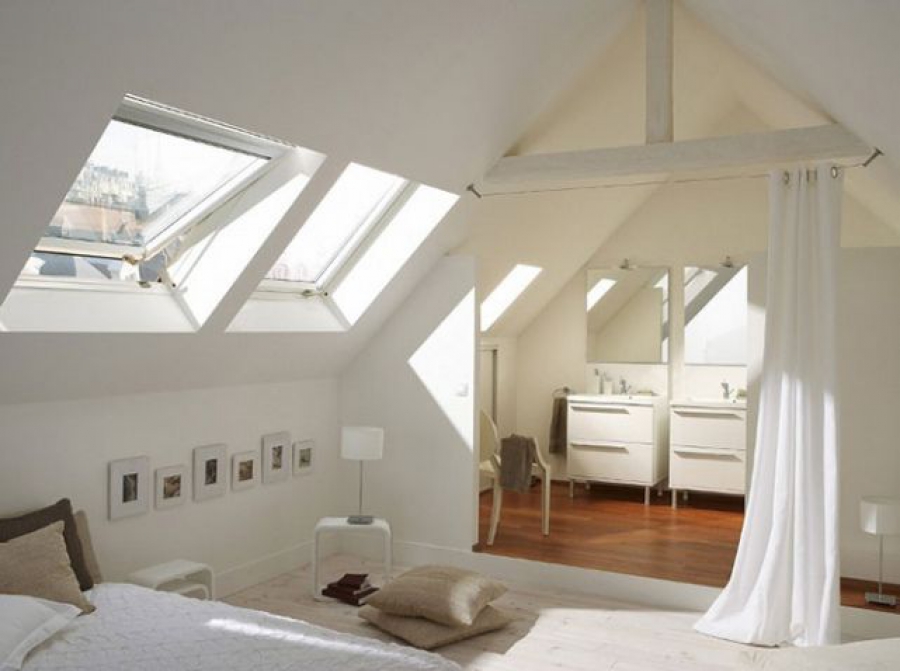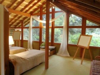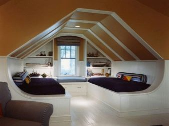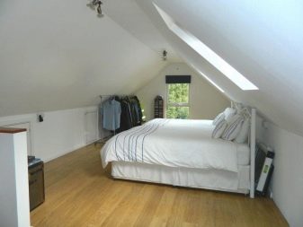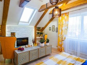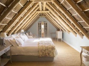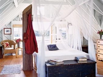Im Dachgeschoss können Sie eine attraktive und praktische Garderobe machen. Sie können, indem ein Bett auf dem Dachboden Luft Baldachin in diesem Teil des Hauses und ein romantisches Schlafzimmer bauen. Die Oberlichter des Daches können mit Miniaturregalen dekoriert werden. Sie können mit Souvenirs, Bildern im Rahmen und anderen Dekors dekoriert werden.