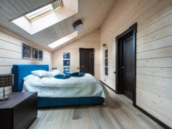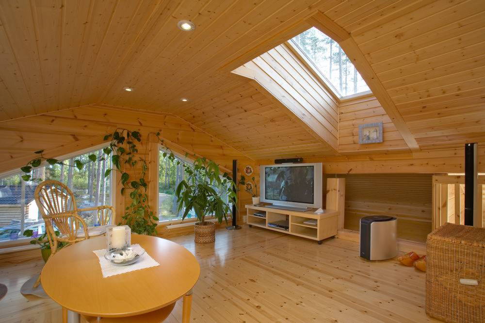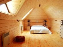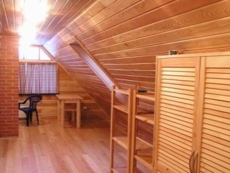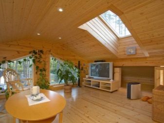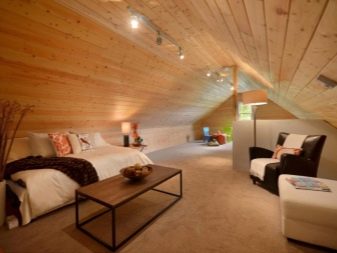 Die Verwendung von Naturholz im Innenraum ist immer relevant. Wenn die Wände des Raums im Dachgeschoss mit Holz dekoriert sind, wird das gleiche Material für die Decke gewählt. Dieses Design schafft eine einzigartige Atmosphäre und einen besonderen Komfort, füllt die Luft mit einem angenehmen harzigen Aroma. Dieses Material wird oft in der Dekoration verwendet, weil die Holzdecke organisch in das Innere fast jedes Landhauses passt.