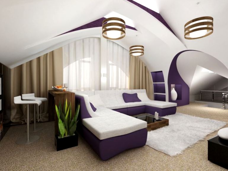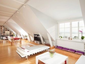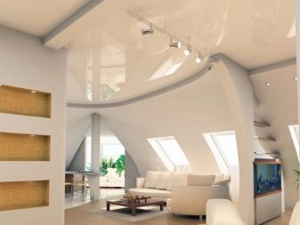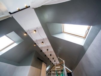 Es ist möglich, solche Konstruktionen aus Trockenbau zu machen, die das Deckenvolumen und die Ausdruckskraft verleihen, ohne sie zu senken. Dies spart die Höhe des Dachzimmers.