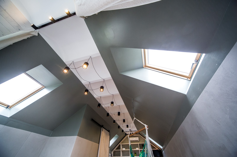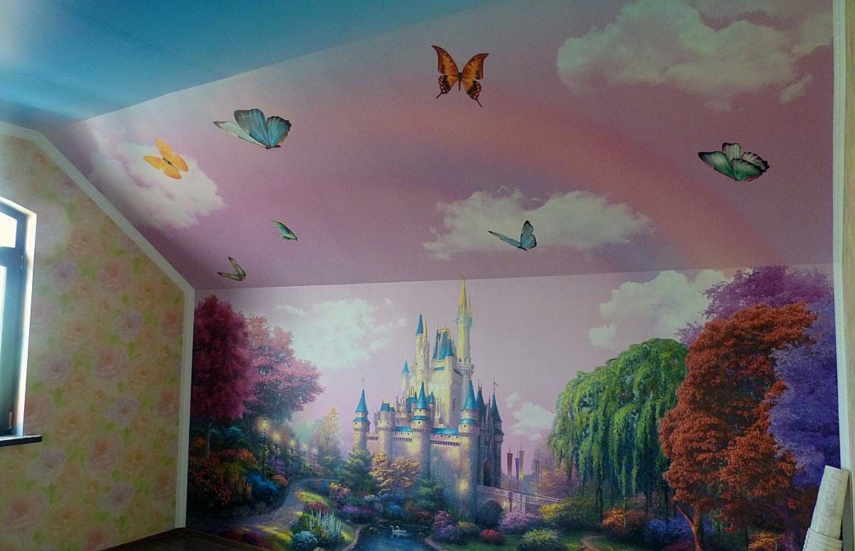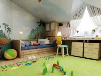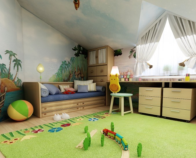 Wenn das Dachgeschoss für ein Kind ausgelegt ist, können Sie ein Kinderzimmer einrichten, damit Sie eine kleine Märchenwelt bekommen. Dies kann Ihnen helfen, Decken mit Zeichnungen zu strecken (z. B. eine Leinwand, die einen blauen Himmel mit flauschigen Wolken und flatternden Schmetterlingen darstellt).