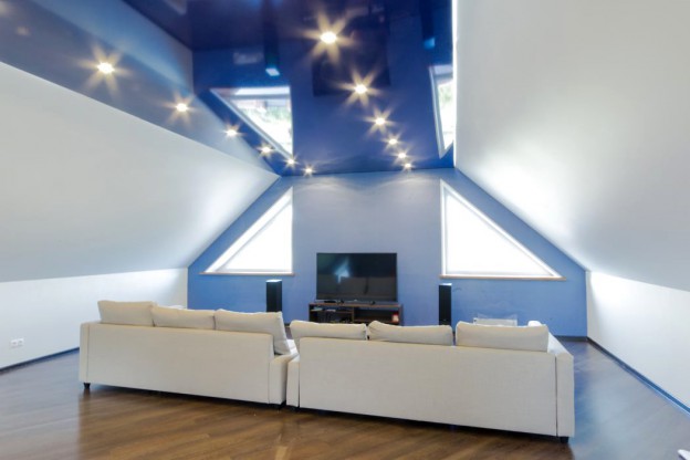 Mit Hilfe solcher Strukturen schaffen sie ein- und mehrstufige Decken in verschiedenen Formen. Sie helfen auch, einige Layoutfehler zu verbergen. Ein Raum mit einer Spanndecke kann in fast jedem Stil und Farbe dekoriert werden. Eine wichtige positive Eigenschaft von Spanndecken ist ihre Feuchtigkeitsbeständigkeit. Dies gilt insbesondere dann, wenn Sie das Risiko eines Lecks des Daches unter dem Einfluss externer Faktoren berücksichtigen.In diesem Fall schützt die Spanndecke den Raum vor überschüssiger Feuchtigkeit. Sie müssen nur die Meister anrufen, die das Material entfernen und das Wasser sanft ablassen.