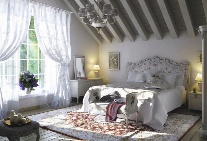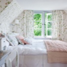 Ein gemütliches Schlafzimmer grenzt in seinen Entscheidungen an die Provence. Lichtvorhänge, Blumen, das Vorhandensein von Holzbedeckungen - alles spricht darüber. Kombinationen können sehr unterschiedlich sein, solange sich hier jeder wohlfühlt.