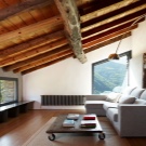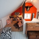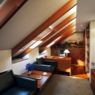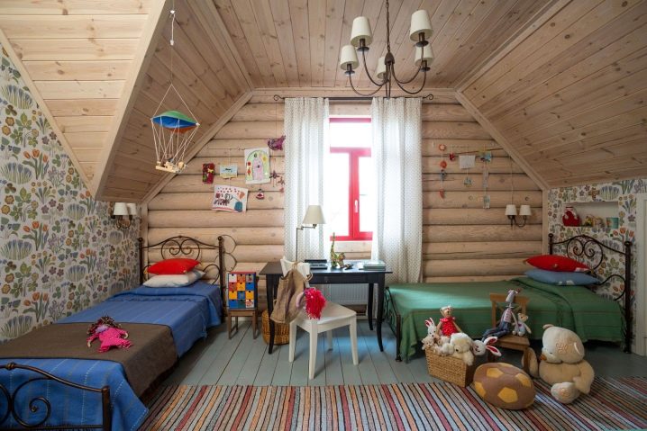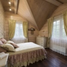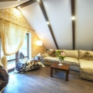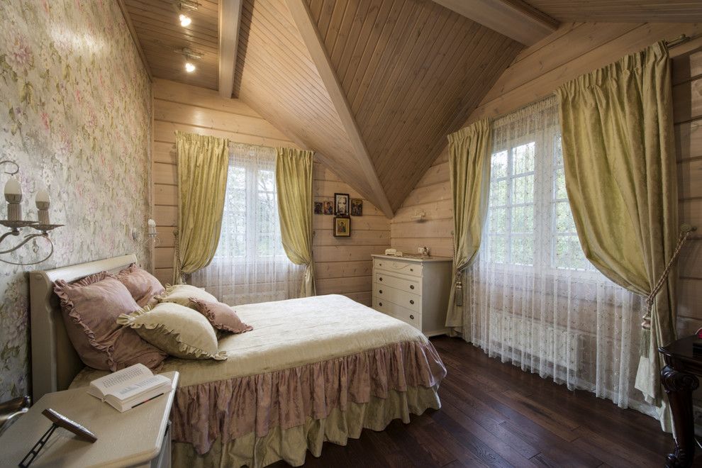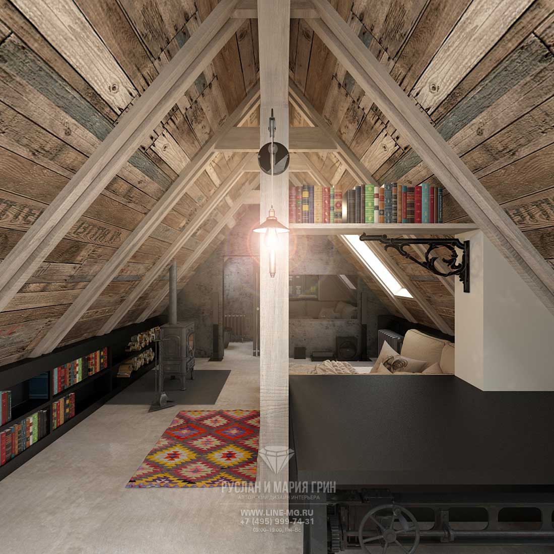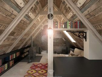 Sie können den Stil des Hauses in den Bergen im Dachgeschoss nachbilden und das passende Design auswählen. Natürliche Materialien sind hier willkommen. Die meisten Oberflächen sind aus Holz. Die Decken in Form von Trägerböden werden perfekt sein, die Holzwände werden sich ergänzen, der Boden wird wie eine Fliese aussehen, die Stein nachahmt. Das Vorhandensein von weichen kleinen Teppichen wird organisch in den gesamten Stil passen. In der Ecke wäre ein kleiner Ofen angebracht (dekorativ oder echt, vom Eigentümer entschieden). Dekorieren Sie ein solches Zimmer und einen Kamin, der im gleichen Stil gestaltet ist.