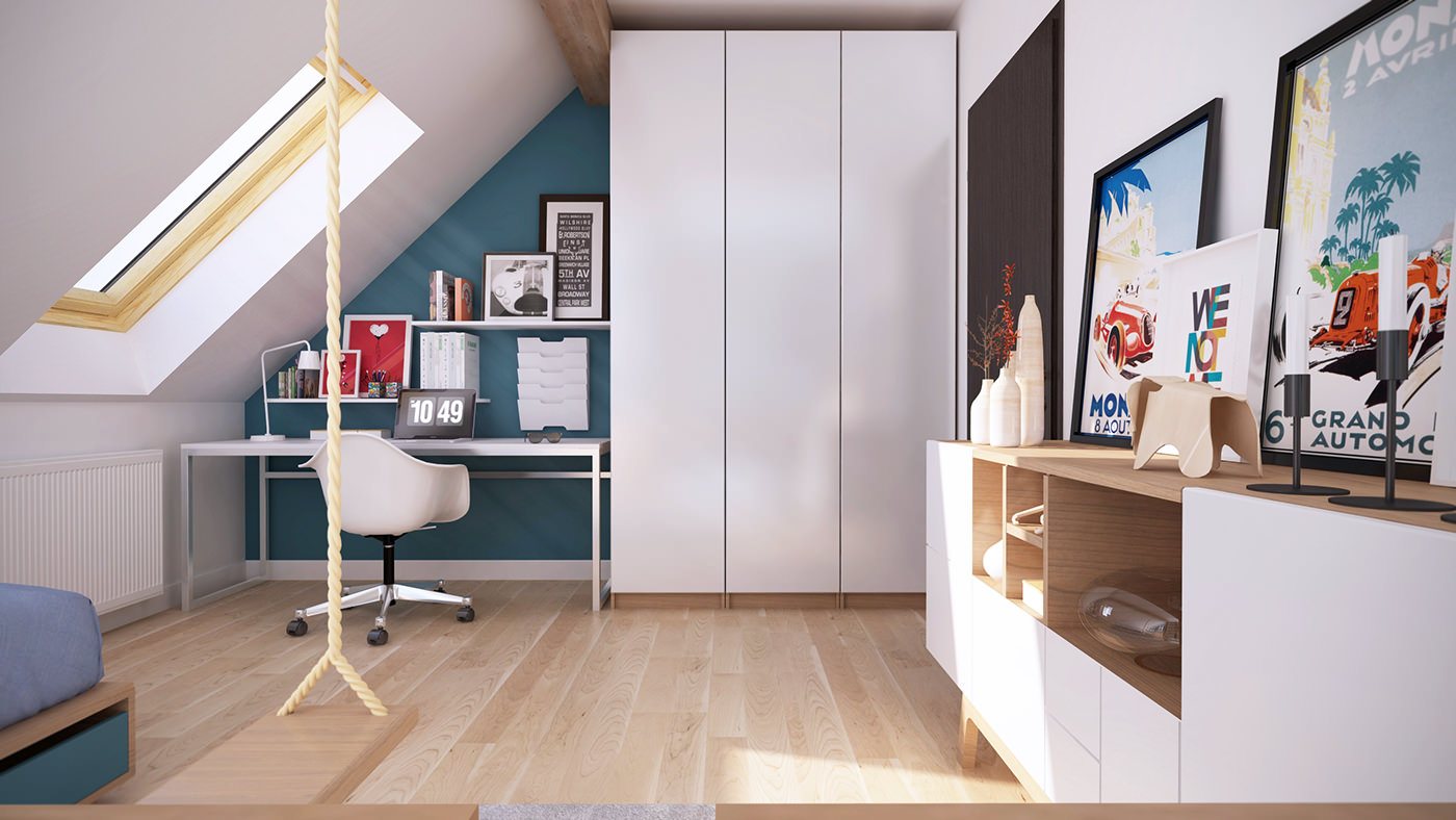Das Original Kinderzimmer für zwei Teenager Kinder, funktional und stilvoll.Es hat alles, was Sie für Erholung und Studium benötigen.