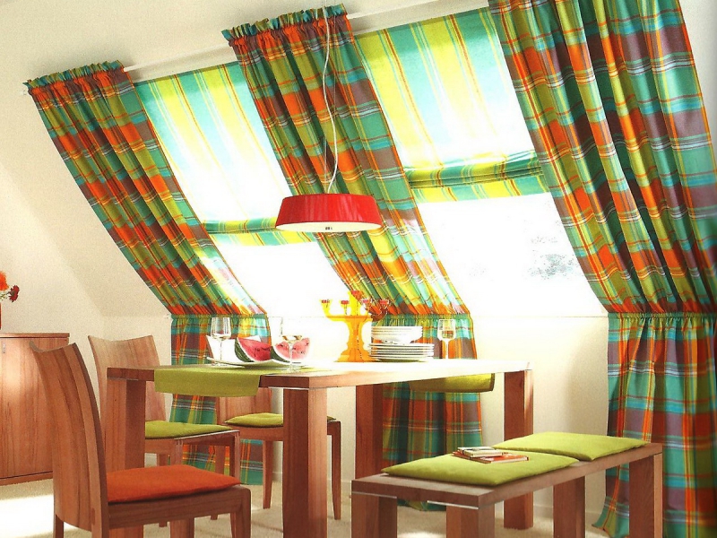 Gemütliches Mini-Esszimmer mit ländlichen Elementen. Dies wird durch karierte Vorhänge, helle Farben kombiniert mit einfachen, aber gleichzeitig modernen Möbeln angezeigt. Ein großes Fenster erlaubt es Ihnen, die umliegende Natur zu bewundern und den Vögeln beim Sitzen bei einer Tasse Kaffee zu lauschen.