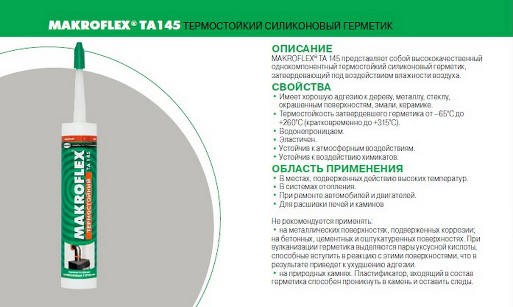 - Makroflex TA145 - super hitzebeständiges Material für den Einsatz bei hohen Temperaturen oder plötzlichen Temperaturschwankungen (Windtanks, Keramikplatten von Herden).Die aushärtende Substanz TA-145 trägt zu einer feuchten Umgebung bei. In der Zusammensetzung gibt es keine Lösungsmittel, das Werkzeug hat keinen Geruch und trocknet innerhalb von 1-2 Tagen.