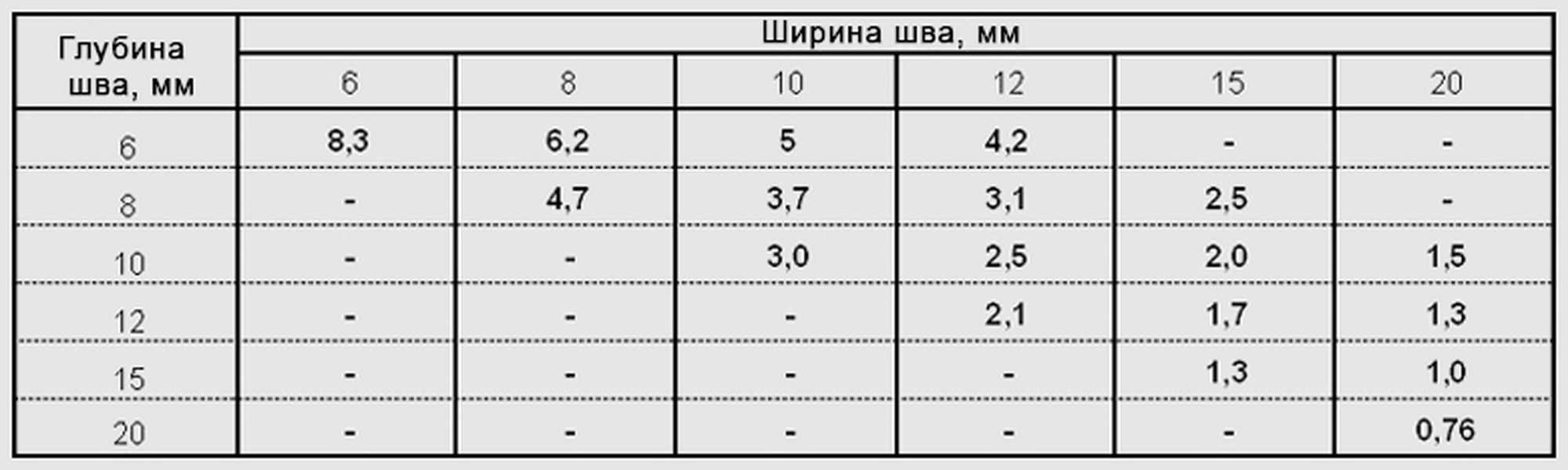 Die Faktoren, die den Materialverbrauch bestimmen, sind die Größe und Form der auf die Oberfläche aufgebrachten Naht. Bei einer rechteckigen Querschnittsform kann eine ungefähre Berechnung der Strömungsrate pro 1 m der Naht unter Verwendung einer vereinfachten Formel durchgeführt werden: G x B, wobei G die Tiefe der Naht (mm) ist, B die Breite der Naht (mm). Wenn zum Beispiel die Breite und Tiefe der Naht 6 mm beträgt, beträgt der Fluss 6 x 6 = 36 ml pro 1 m der Naht. Bei einer dreieckigen Naht sieht die Fließformel wie folgt aus: ½ B × G. Das heißt, bei gleicher Breite und Tiefe, beispielsweise 12 mm, beträgt der Fluss: 6 × 12 = 72 ml pro 1 Meter Naht.