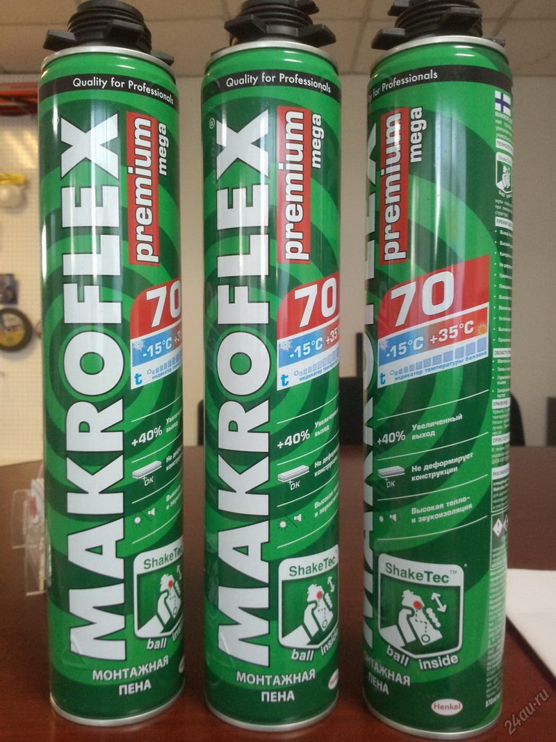 - Makroflex Pro unter Verwendung von Spezialwerkzeugen erreicht die praktische Ausbeute des Materials 65 Liter. Die Zusammensetzung enthält keine Chlor-, Fluorid- oder Kohlenstoffeinschlüsse, wird bei der Isolierung von Fenstern und Türen verwendet und füllt verschiedene Hohlräume. Als Dichtungsmittel zur Isolierung von Räumen.
