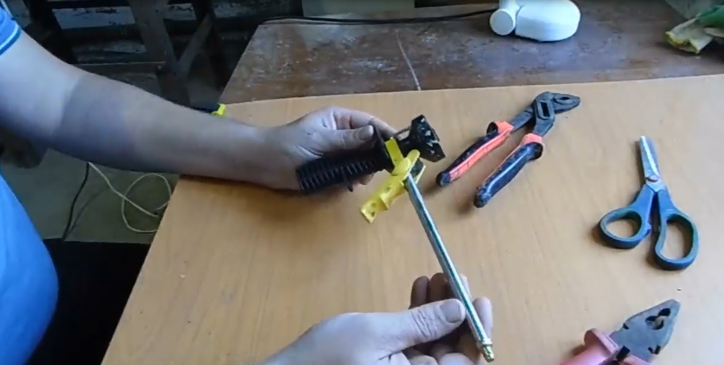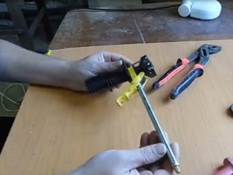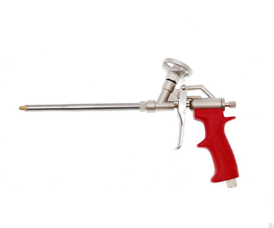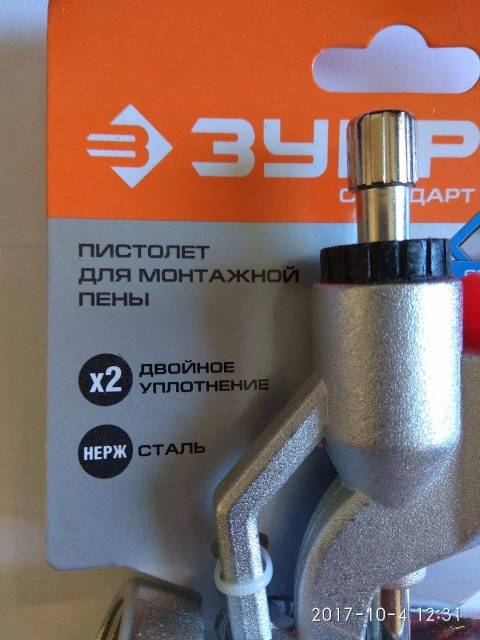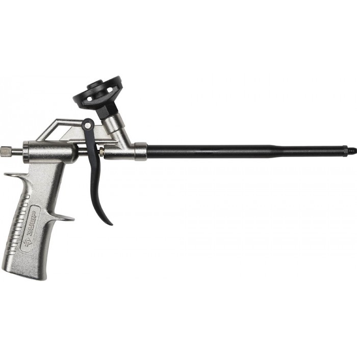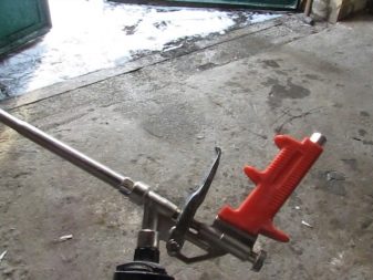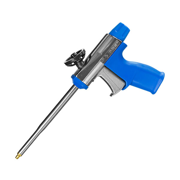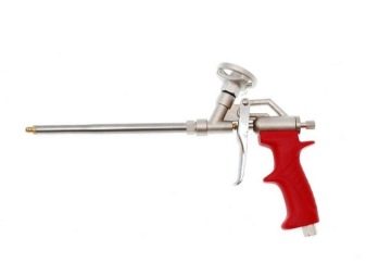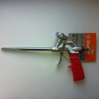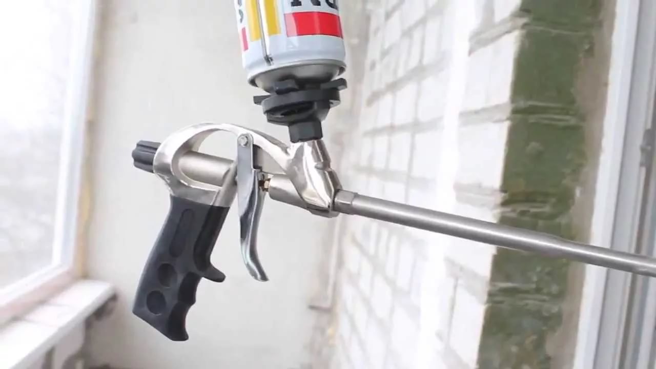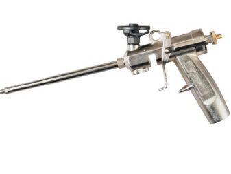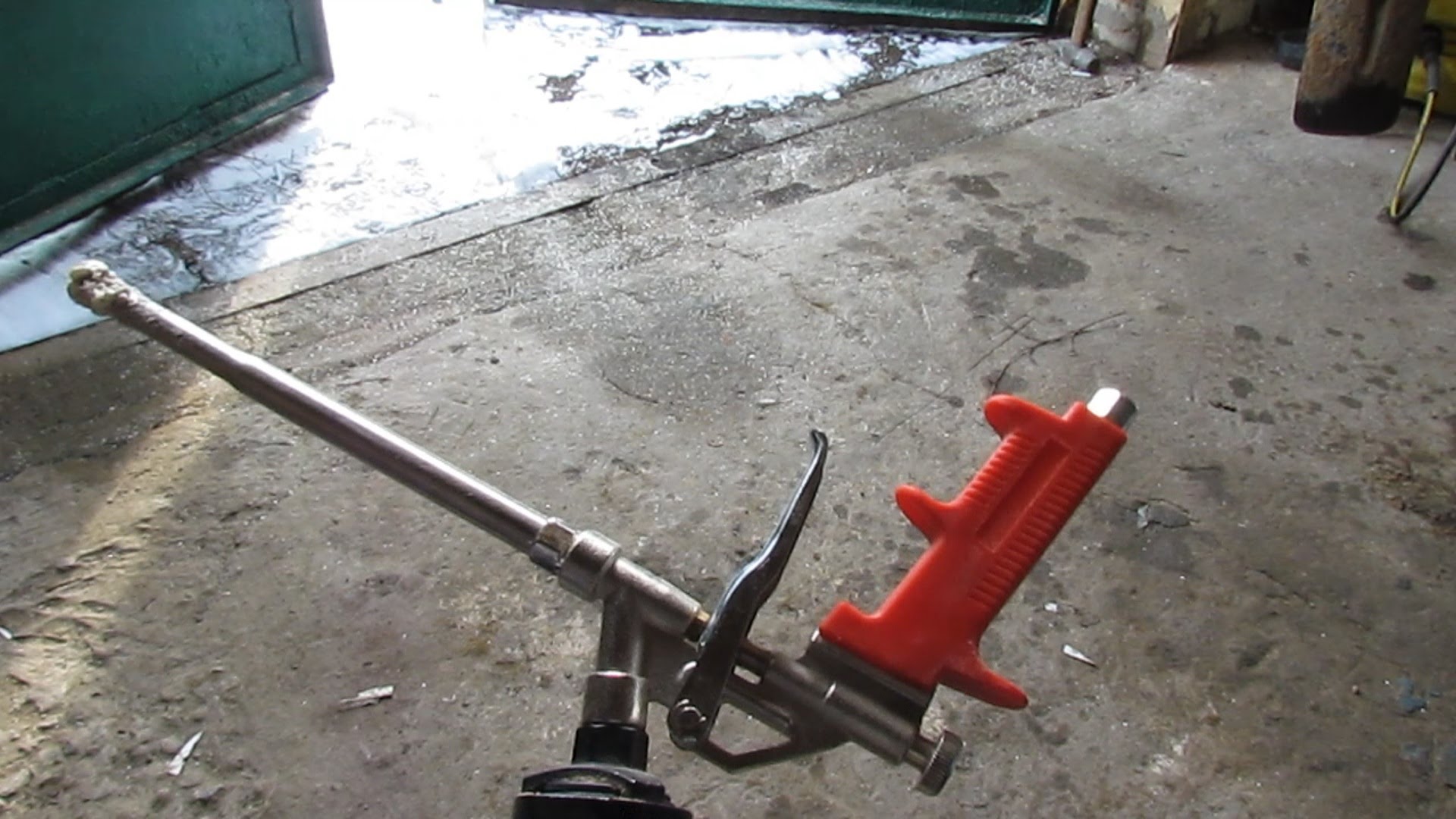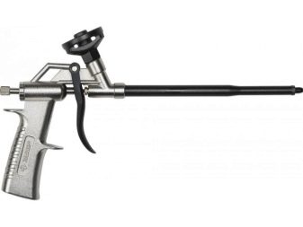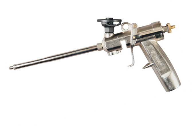 Der Hauptteil der Waffe - der Lauf, der ein normaler Hohlzylinder ist. An seinen Rändern befinden sich spezielle Ventile. Die Schaumflasche ist am Adapter befestigt. Dann ziehen Sie vorsichtig den Abzug, während Sie unbedingt die Waffe halten müssen. Danach beginnt das Montagematerial durch die Düse zu fließen, deren Volumen und deren Vorschubgeschwindigkeit mit einer Klemme eingestellt werden kann.