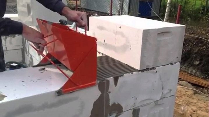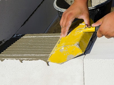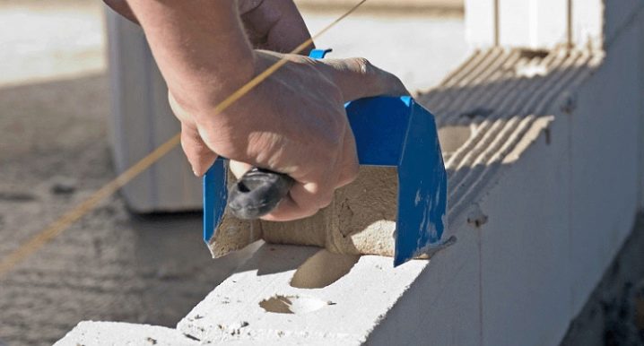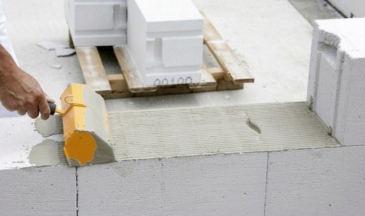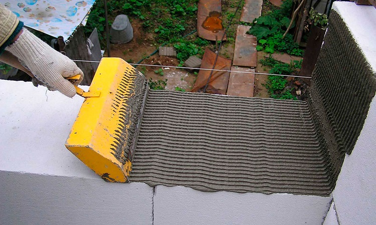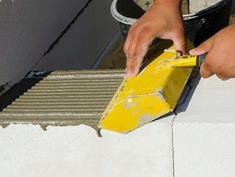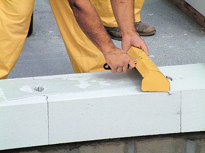 - die Konstruktion der Bausteine wird mit ihrer Verlegung auf dem Leim durchgeführt; vor dem Aufbringen einer Schicht Klebstoffgemisch aus den Blöcken ist es notwendig, Staub zu entfernen, da sich sonst aufgrund von Schmutzpartikeln Klumpen im Gemisch bilden, die die Zuverlässigkeit der Naht beeinträchtigen;