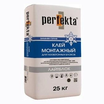 - Winterleim für Schaumblöcke können im Temperaturbereich von -10 bis + 5ºС verwendet werden. Diese frostbeständige Zusammensetzung härtet nach 30 Minuten nach der Herstellung aus, weshalb empfohlen wird, sie für die Arbeit in kleinen Portionen zu verdünnen.