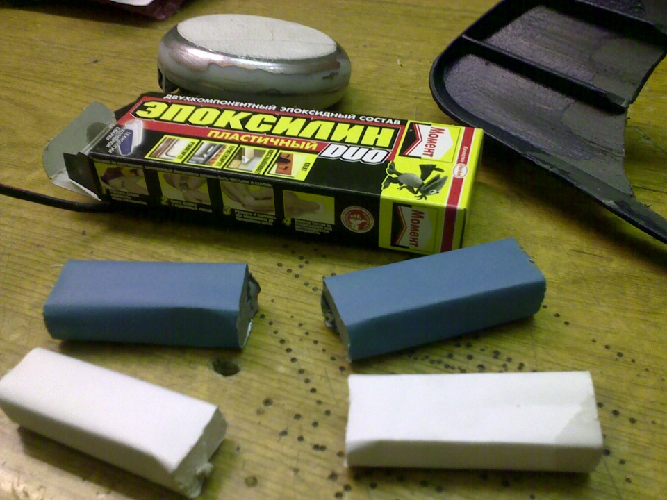 - Plastikmasse muss sich vorbereiten. Schneiden Sie dazu die benötigte Menge aus dem Inhalt einer zylindrischen Röhre oder Stange, kneten Sie diese mit den Händen und befeuchten Sie sie mit Wasser. Plastikmasse eignet sich hervorragend zum Reparieren von Chips, Grübchen und anderen Defekten.