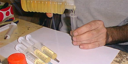 Es ist notwendig, die Zutaten in den erforderlichen Mengen zu messen. Zu Hause ist es sehr praktisch, dies in medizinischen Spritzen zu tun, da sie dimensionale Unterteilungen haben. Darüber hinaus ermöglicht Ihnen die Spritze, den Eingriff sorgfältig durchzuführen und die richtige Dosierung, auch in kleinen Mengen, zu treffen. Es ist nicht notwendig, eine Nadel in die Spritze einzuführen. Das Harz und der Härter sollten in getrennten Spritzen gesammelt und in verschiedene Behälter gefüllt werden.Wenn das Harz zu dick ist, kann es von oben in die Spritze gegossen werden, nachdem zuerst der Kolben entfernt und der Ausguß geschlossen wurde. Dann werden beide Substanzen gründlich gemischt, um eine homogene Masse zu erhalten.