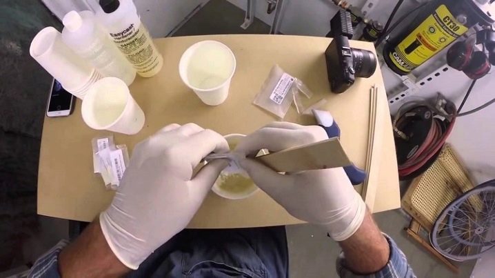 Um den Kleber zu Hause zu mischen, müssen Sie sich auf den Prozess vorbereiten.Es wird empfohlen, Arbeiten in einem gut belüfteten Raum durchzuführen - das Einatmen von Epoxidharzdämpfen ist für den Körper nicht von Vorteil. Atemschutz tragen. Für die Arbeit ist es nötig die Schutzhandschuhe zu verwenden. Sie sollten alte Kleidung tragen und den Arbeitsplatz mit etwas bedecken - es wird extrem schwierig sein, den Klebstoff, der auf sie fiel, zu entfernen.