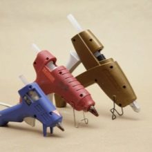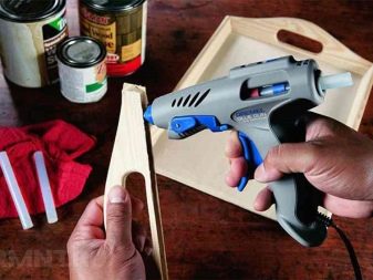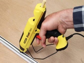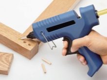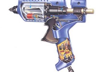 Heißkleber ist ziemlich einfach zu bedienen. Zusätzlich zu den Stäben ist es notwendig, eine spezielle Pistole zu kaufen, die festen Füllstoff bei hoher Temperatur lösen und in eine flüssige Mischung verwandeln kann.Die Pistolen sind batteriebetrieben und werden vom Netz gespeist. In der Regel erwärmt sich das Gerät schnell, danach ist es notwendig, eine Patrone in das ovale Loch einzuführen und den Knopf auf dem Gehäuse zu drücken. Unter Druck wird nach und nach Kleber herauskommen, Tropfen für Tropfen. Alles, was Sie zum Arbeiten brauchen, können Sie im Baumarkt kaufen. Patronen in Form von gehärteter Zusammensetzung werden sowohl in Sätzen als auch einzeln verkauft.