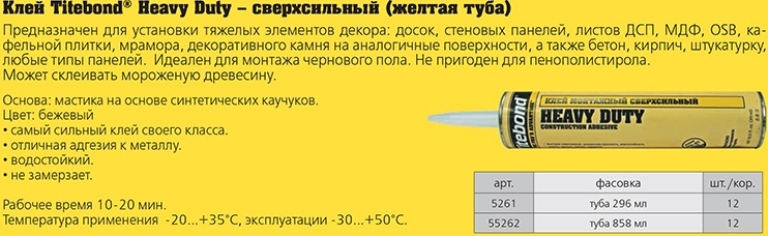 Wie der vorherige Typ wird Heavy Duty nur auf eine der Oberflächen angewendet. Die Aushärtungszeit der Zusammensetzung beträgt 20 bis 30 Minuten. Die Entfernung von frischem Kleber wird mit Hilfe von Mineralalkohol gemacht.