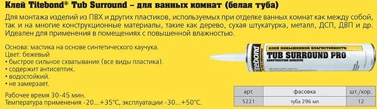 Der Tub Surround Kleber wird für den Gebrauch in Badezimmern empfohlen. Es verbindet perfekt Kunststoffstrukturen, einschließlich Formteile und Produkte aus Hartkunststoff. Der Hauptwirkstoff ist ein starkes Lösungsmittel, das Materialien nicht beschädigt.