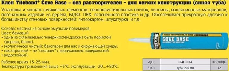 Diese Verbindung hilft beim Verkleben von PVC- und Gummierungsstrukturen sowie Akustikplatten. Die darunterliegende Oberfläche kann Platten aus Trockenbau, Kitt, Anstrich und Tapeten sowie Keramikfliesen sein. In Kontakt mit der Oberfläche verhindert der Kleber, dass die Befestigungsmaterialien nach unten rutschen. Es bildet keine schädlichen Dämpfe, entzündet sich nicht und erfüllt vollständig die in der Russischen Föderation und den Vereinigten Staaten geltenden Vorschriften.