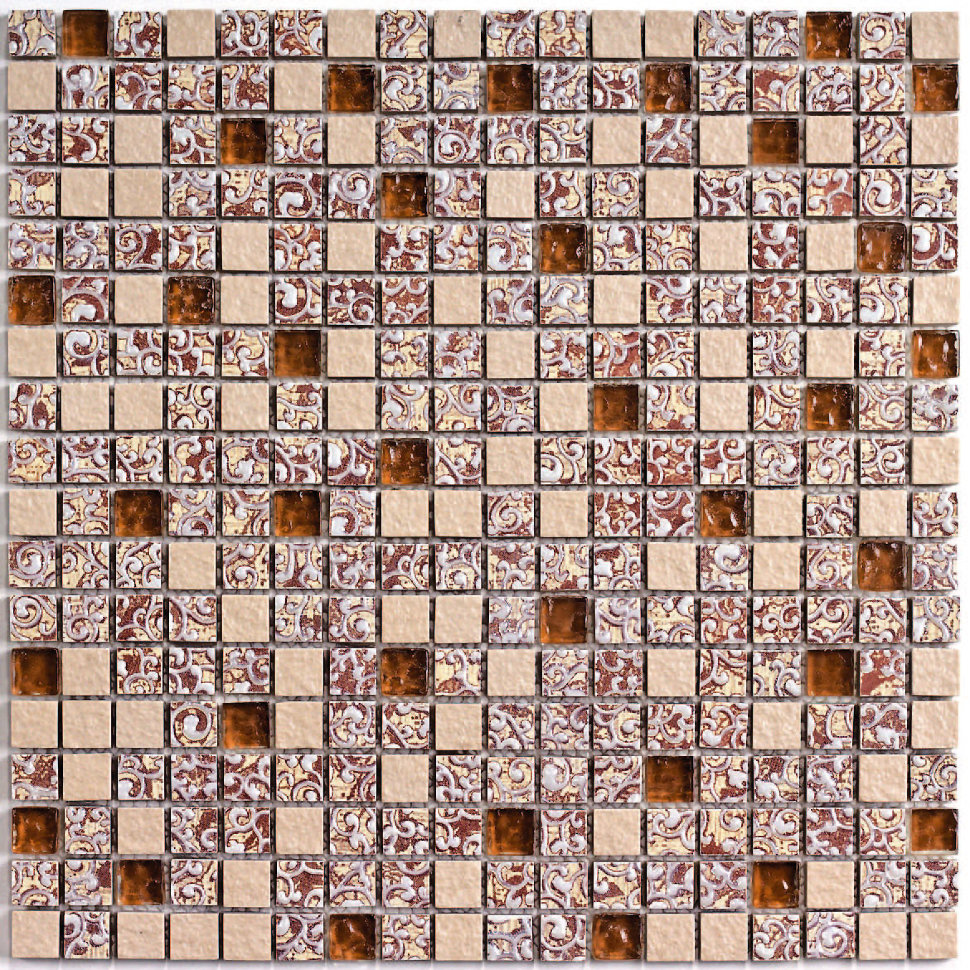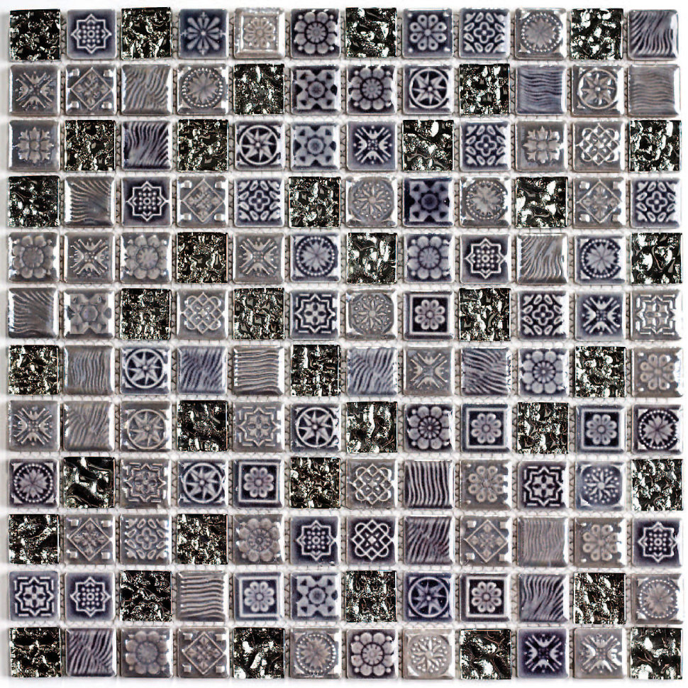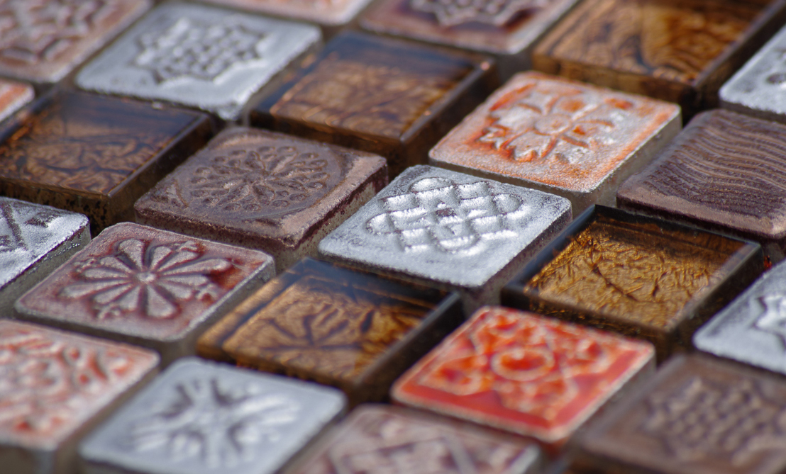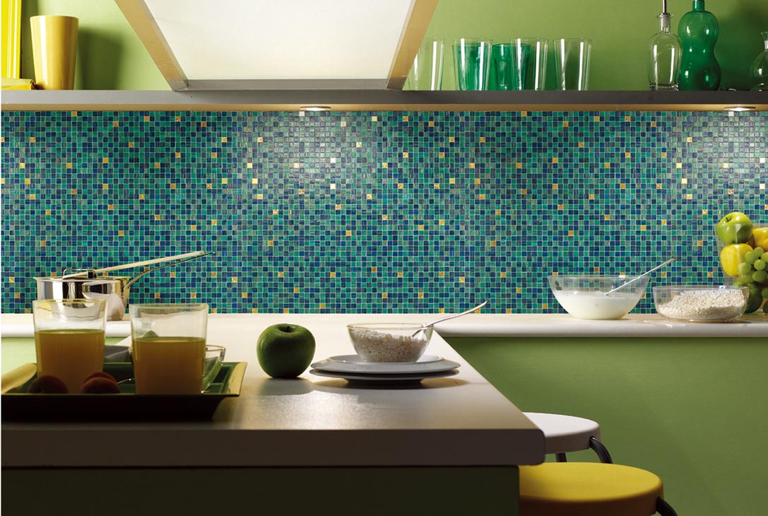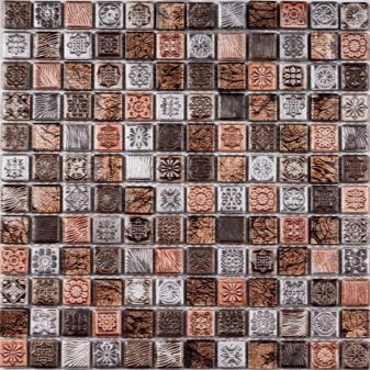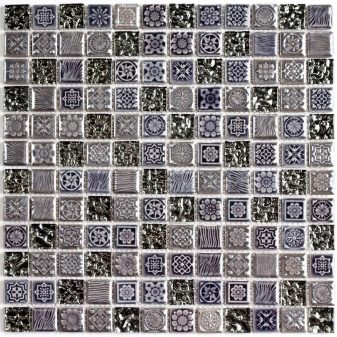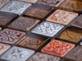 Keramisches Mosaik hat eine große Auswahl an Farben, die in jedem Interieur passen. Es hat keine dünne Glastransparenz, aber die Glasur, die die Keramik bedeckt, kann eine umfangreichere Farbpalette aufnehmen. Keramik "unter dem Metall" ist sehr beliebt, mit dem edlen Glanz von Gold, Silber oder Platin.