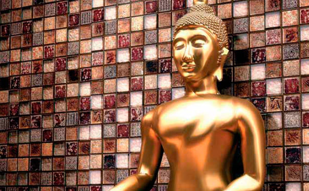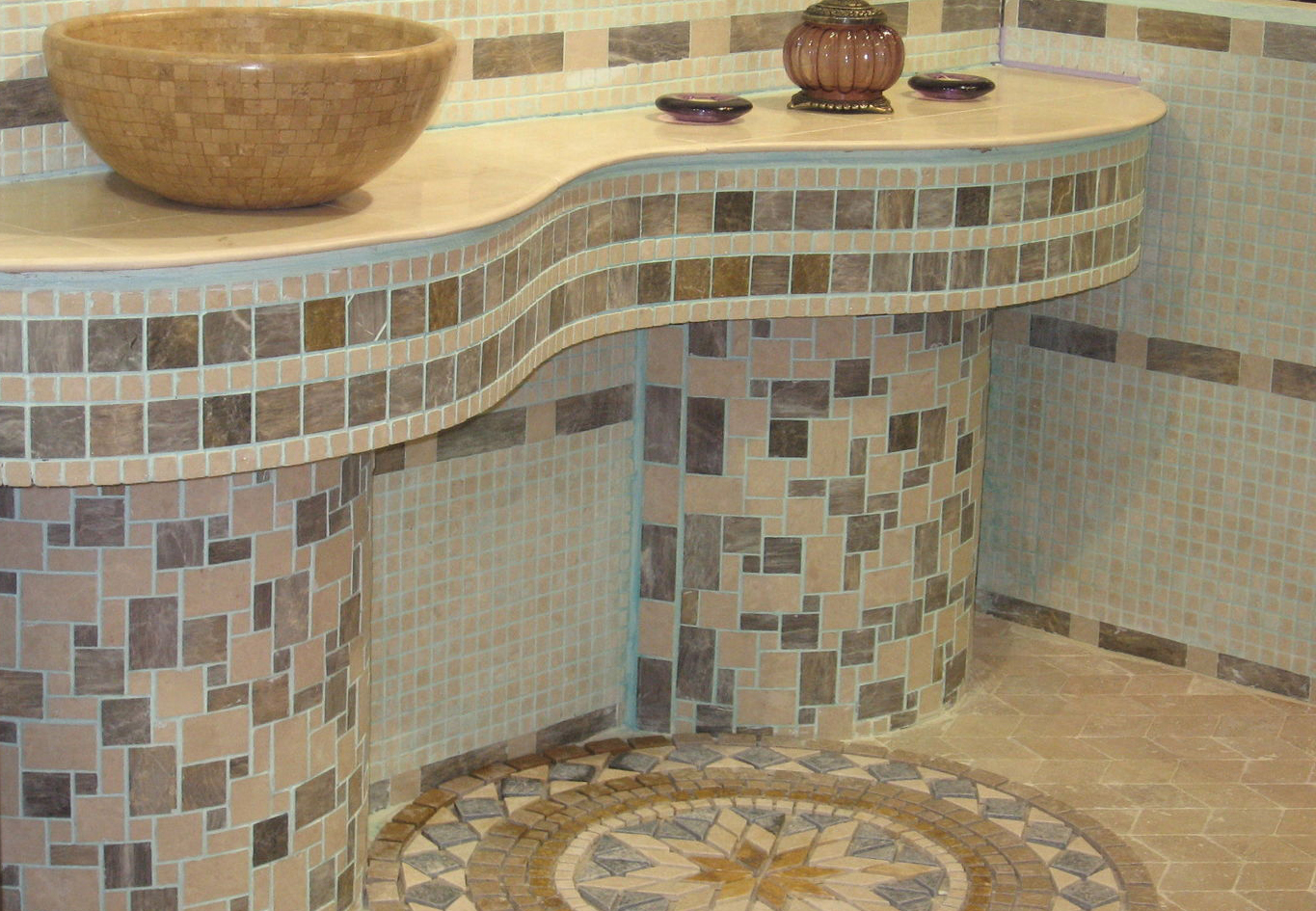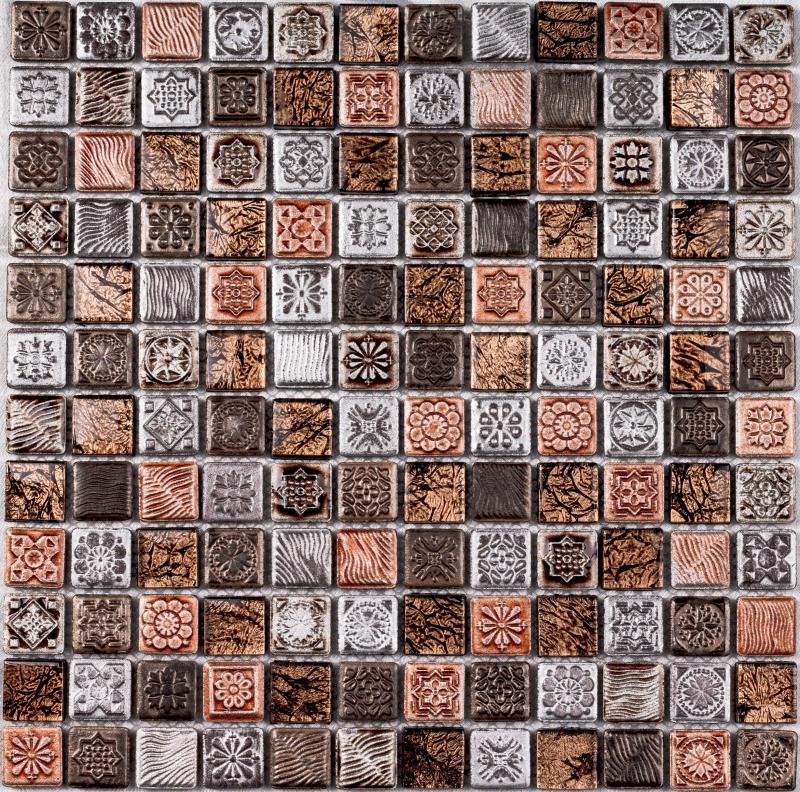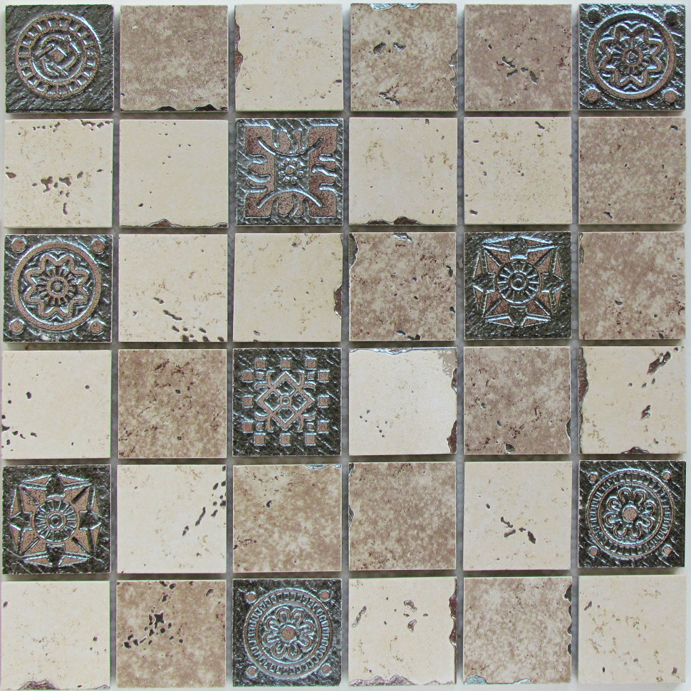 Keramisches Mosaik hat eine große Auswahl an Farben, die in jedem Interieur passen. Es hat keine dünne Glastransparenz, aber die Glasur, die die Keramik bedeckt, kann eine umfangreichere Farbpalette aufnehmen. Keramik "unter dem Metall" ist sehr beliebt, mit dem edlen Glanz von Gold, Silber oder Platin.