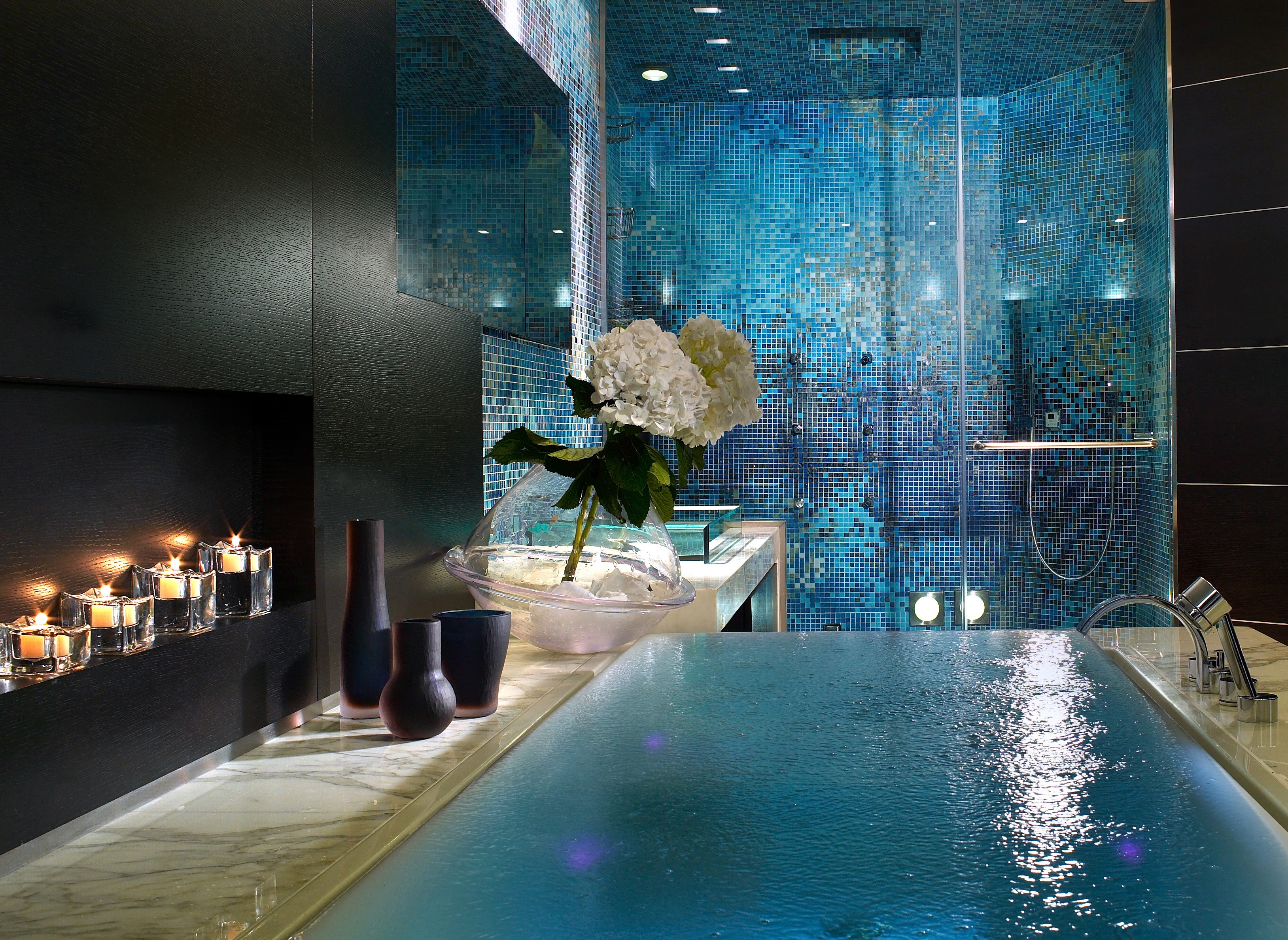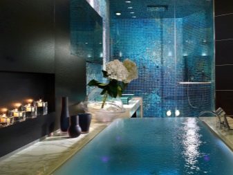 Die einfachste Art, ein Mosaik für Schwimmbecken und künstliche Teiche zu wählen. Hier werden die blauen und blauen Sorten perfekt aussehen - Blaue Welle, Blaue Tropfen, Energie, Ozean, Satin Blau, Atlantik. Helle und undurchsichtige Optionen heben das Wasser im Pool hervor und verleihen ihm den Charme, der in ausländischen Hotels herrscht.