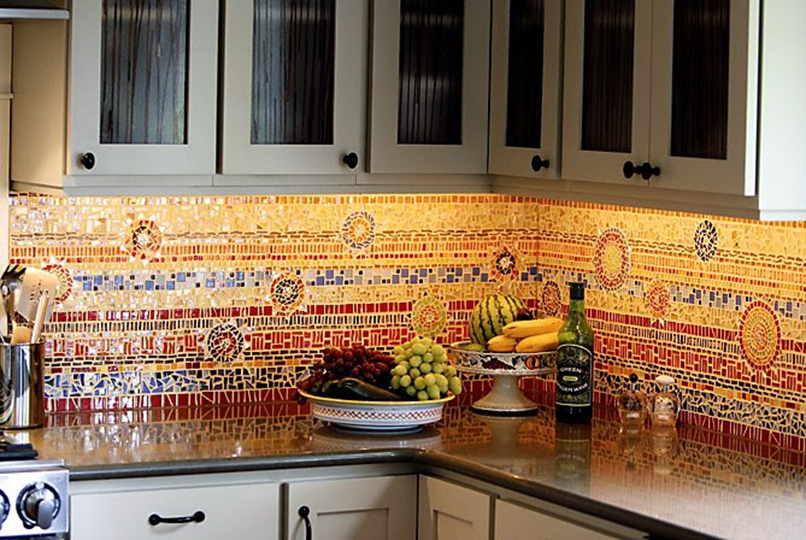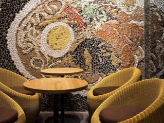 Um die Ränder des Bildes zu formen, sollten große rechteckige Stücke sein. Wenn die Kontur fertig ist, können Sie mit der weiteren Installation fortfahren. Die Technik zum Erstellen eines Mosaiks ist einfach, aber Sie müssen Geduld, Farbwahrnehmung und künstlerischen Geschmack haben. Mosaik-Paneele passen zu vielen Stilen. Alles hängt von der Handlung des Bildes ab.