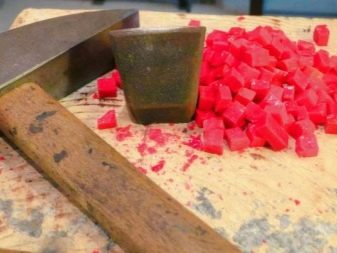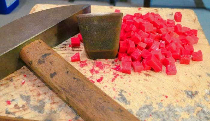Auf einem hölzernen Stumpf müssen Sie eine Platte von Smalt installieren, mit einem Meißel gesichert und vorsichtig kleine Stücke mit einem Hammer abtrennen. Die resultierenden Chips sollten nach Farbe, Größe und Form sortiert werden.