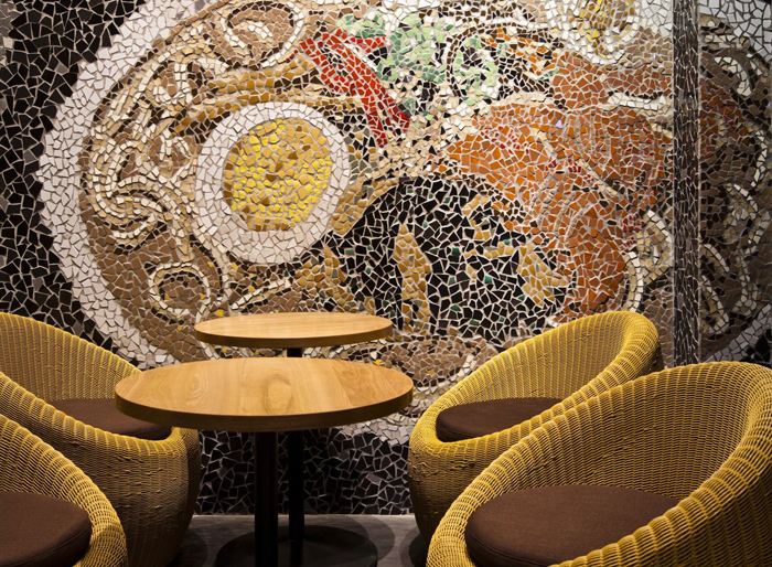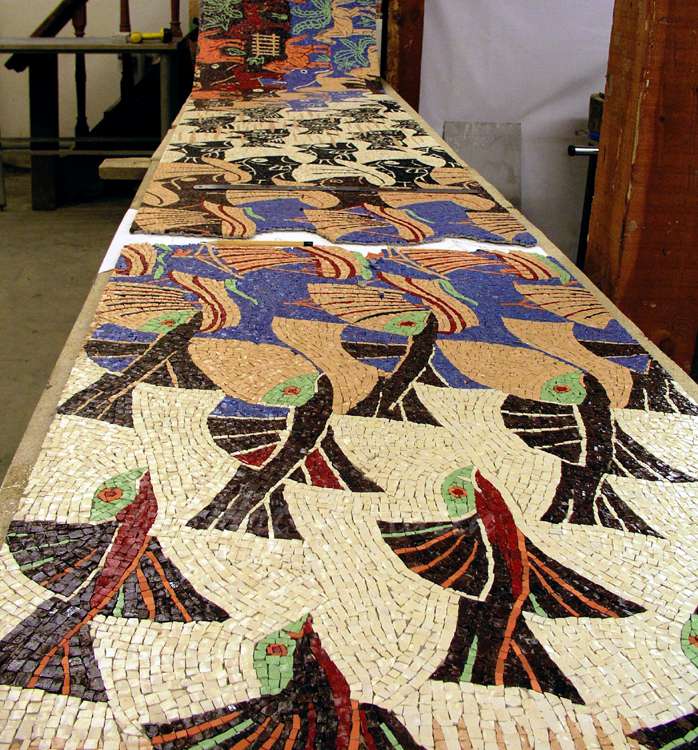 Abgesehen von der modernen Technologie bleibt die Ausführung des kleinen Mosaiks mühsame Handarbeit, die Genauigkeit, Aufmerksamkeit und Geduld erfordert. Die Farbfähigkeiten des Produkts in der Produktion von klassifizierten. Aber auch bei genauer Betrachtung des Rezepts wird jedes Mal ein anderes Produkt erhalten. Die Heterogenität des Materials, eine Kombination aus matten, transparenten und transluzenten Schichten, führt zu einem erstaunlichen inneren Leuchten.