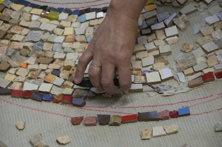 Nach dem Absplittern müssen die Arbeitsfläche und die Umgebung sorgfältig entfernt werden, um den Kontakt des Haushalts mit Glassplittern zu verhindern. In der nächsten Phase wird ein Raum für Arbeiten am Panel vorbereitet.Eine geeignete Grundlage ist eine trockene, harte Oberfläche, die von Staub und Unregelmäßigkeiten gereinigt wird. Sonst werden die kleinen Stücke abplatzen. Wenn die Oberfläche vorbereitet ist, können Sie ein Mosaik auslegen. Es gibt zwei Methoden dieser Aktion: direkt und rückwärts.