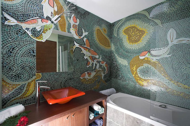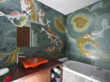 Das Hauptmerkmal dieses Materials ist, dass es unabhängig verwendet werden kann (um eine kontinuierliche Verlegung über die gesamte Oberfläche zu erzeugen). Darüber hinaus eignet es sich für die partielle Dekoration von Oberflächen. Es kann als dekoratives Fragment verwendet werden und kombiniert ein Mosaik mit gewöhnlichen Fliesen oder einem anderen Ausrüstungsmaterial. Mosaikfliesen werden oft zum Verkleiden von Bädern oder Waschbecken verwendet, wonach langweilige Sanitärgegenstände mit neuen Farben zu spielen beginnen und im Mittelpunkt des Interesses stehen.