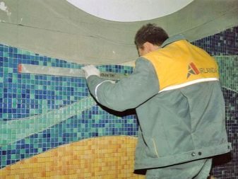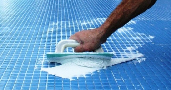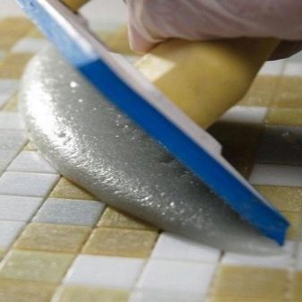 Es ist notwendig, den Mörtel zu wählen, der aus kleinen Partikeln mit Glitzer besteht, sie geben dem Gesamtbild der Fliesen originelles Aussehen.