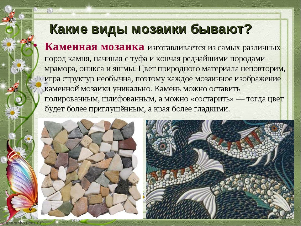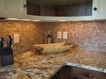 - Stein Das Mosaik besteht heute aus verschiedenen Arten von Steinen. Es kann Granit, Marmor sein. Die Einzigartigkeit dieses Materials liegt in seiner Textur, dank der es möglich ist, einzigartige Dekorelemente zu schaffen. Diese Art von Fliesen wird oft verwendet, um den Boden zu dekorieren, damit Sie sogar einen Steinteppich schaffen können.