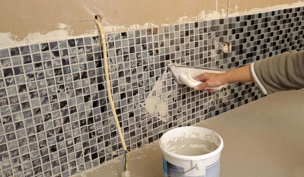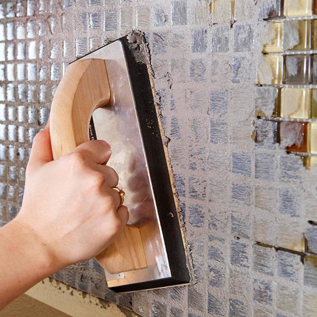 Nachdem Sie den Mosaik-Installationsprozess abgeschlossen haben, können Sie mit dem Finish fortfahren. Leimreste gründlich reinigen. Es wird empfohlen, die Oberfläche ein wenig trocken zu lassen und erst danach in die Endphase zu übergehen: Verfugen. Sie können einen Fugenmörtel auf der Basis von Latex, Epoxidharz oder flüssigem Glas verwenden, wobei Epoxidharzmörtel zu beachten ist, der am häufigsten in Räumen mit hoher Luftfeuchtigkeit verwendet wird. Flüssigglas kann als Universalmörtel angesehen werden.